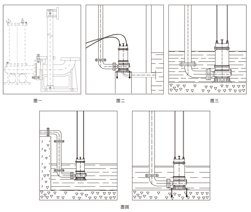 2、最低運行液位:見安裝尺寸圖(無電機冷卻系統(tǒng)),有電機冷卻系統(tǒng)時,水位只要保證泵能正常輸水;
