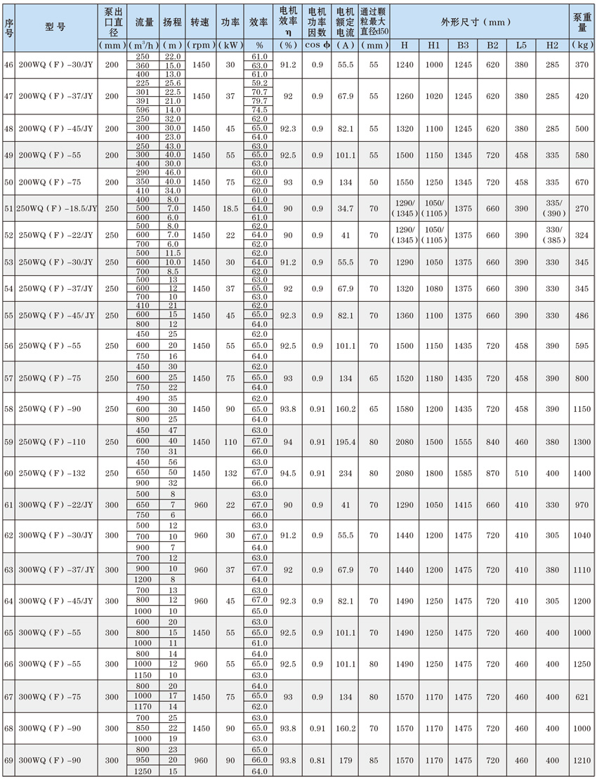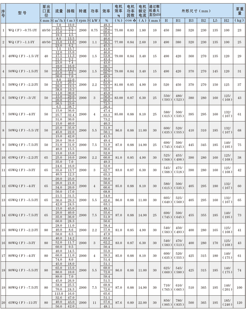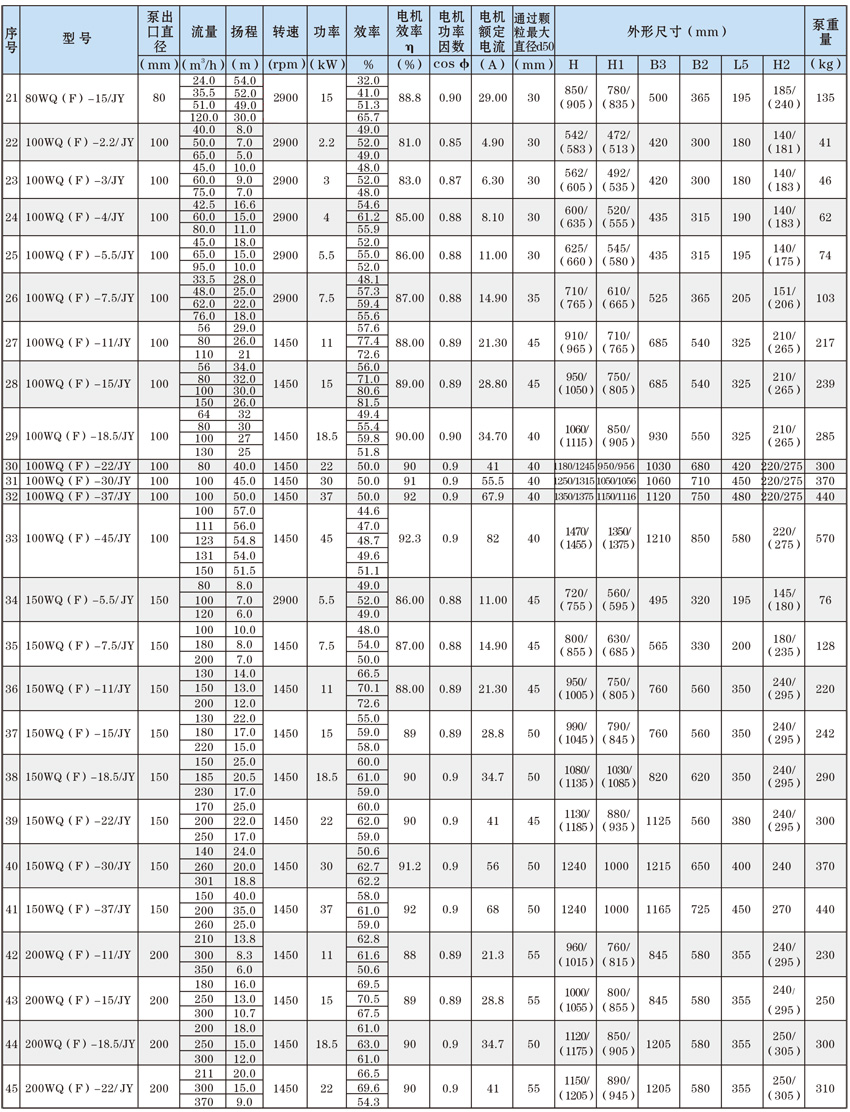 為了使WQ(F/JY)系列潛水污水泵以更好的可靠性、更高的機組效率服務(wù)于客戶,在總結(jié)25年生產(chǎn)制造該系列泵的經(jīng)驗積累的基礎(chǔ)上,再一次更新優(yōu)化了水力模型,創(chuàng)新機械密封、軸承結(jié)構(gòu),采用優(yōu)質(zhì)電機材料,根據(jù)使用環(huán)境條件,18.5kW及以上泵對電機循環(huán)冷卻,保證可靠性。全系列共111個基本規(guī)格,通過使用原型葉輪和改型葉輪及其切割,在型譜性能范圍內(nèi),可提供恰當(dāng)滿足用戶所需要的任意流量、揚程工作點的水泵。
